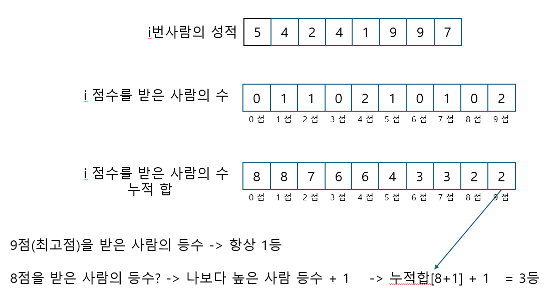 3. 누적합을 통해 해당 점수가 몇등인지 계산한다.