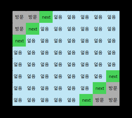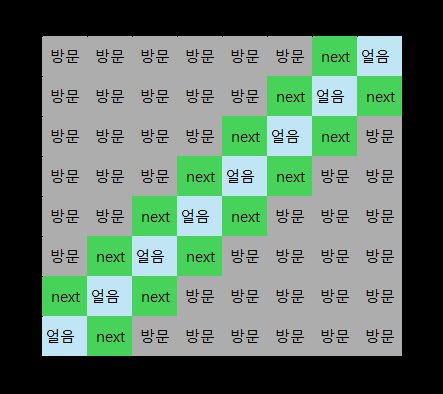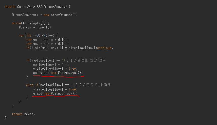 BFS를 진행하면서 얼음을 만난 경우 다음 BFS에 사용할 Queue인 nextq에 넣어준다.