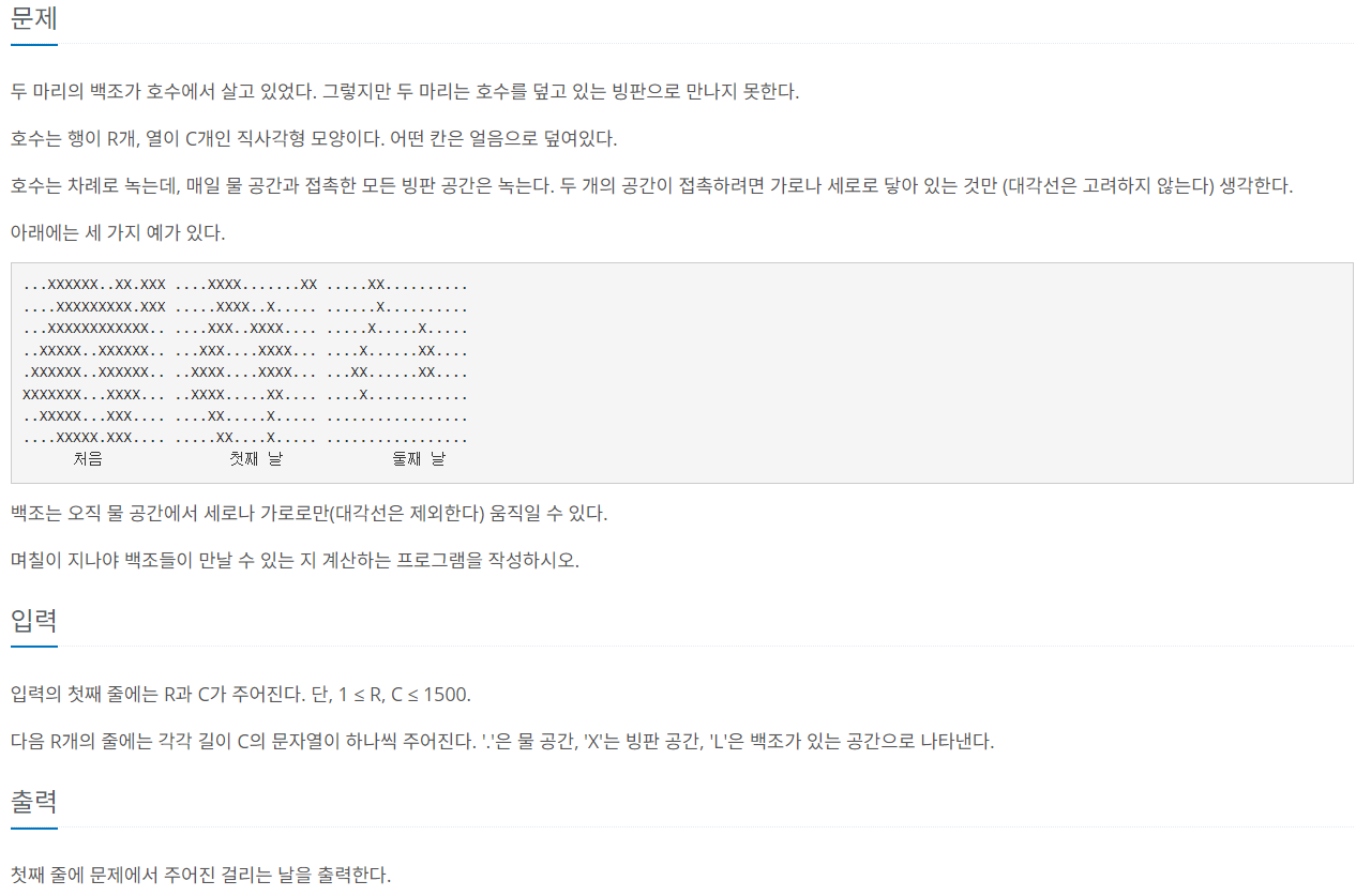 입력의 첫째 줄에는 R과 C가 주어진다. 단, 1 ≤ R, C ≤ 1500. 다음 R개의 줄에는 각각 길이 C의 문자열이 하나씩 주어진다. '.'은 물 공간, 'X'는 빙판 공간, 'L'은 백조가 있는 공간으로 나타낸다.