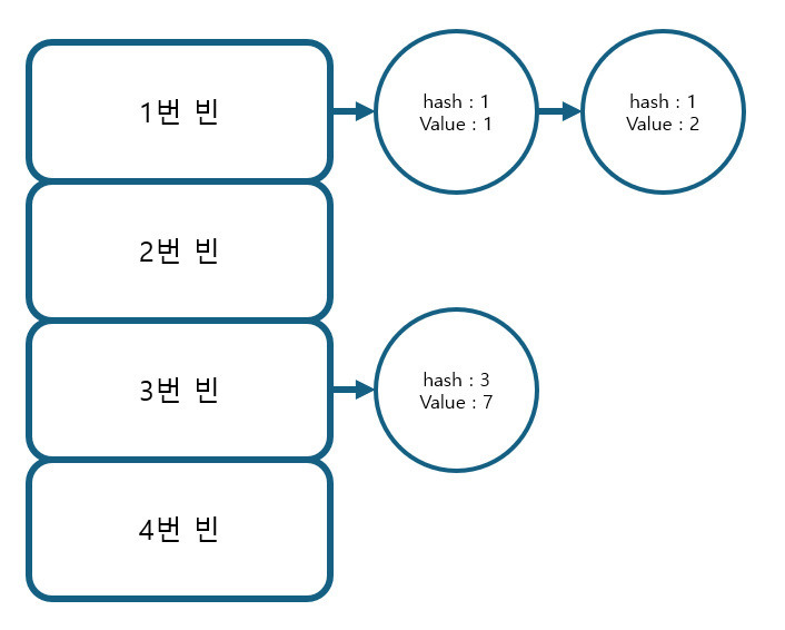 만약 1번 빈에 노드가 N개가 있다면, 1번 빈에 해당 노드가 존재하는지 찾는 시간은 O(N)이다.