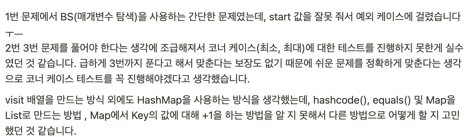이후 후기를 작성했는데, 쉬운 문제를 빨리 풀고 넘어가기보다 정확히 풀고 넘어가는게 중요하다고 느꼈다. 1,2,3번 문제 모두 테스트 케이스는 통과했지만 채점 케이스에서 2개 혹은 1개가 걸려서 틀렸다.