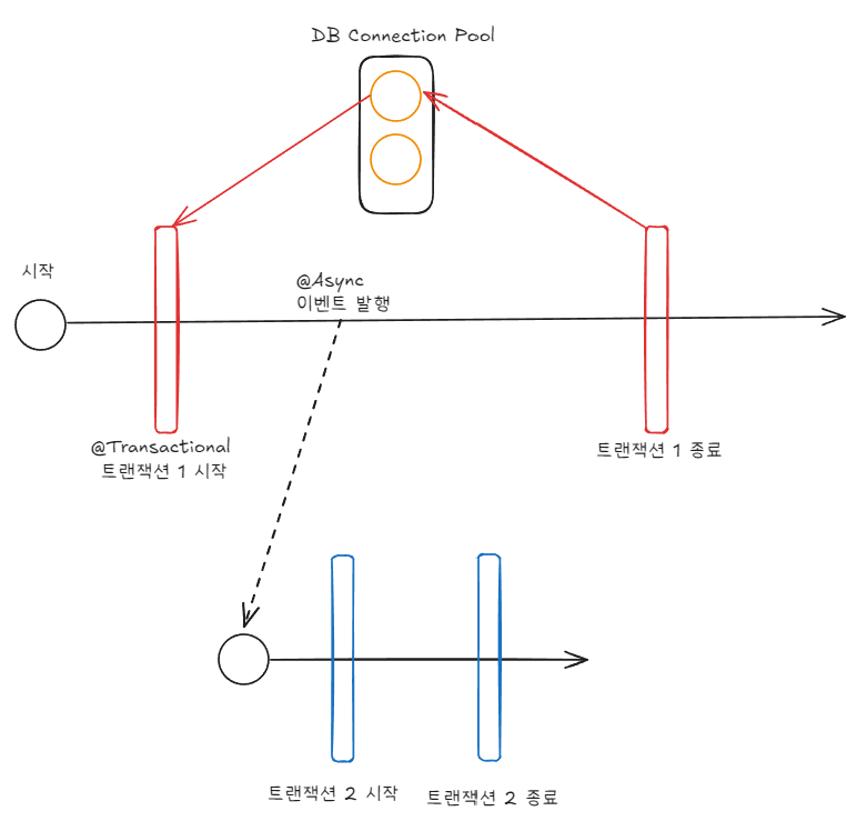 비동기 이벤트를 발행하여 트랜잭션을 별도 스레드에서 처리할 수 있습니다. 하나의 요청이 처리되기 위해 동시에 2개의 Connection이 필요했던 문제가 해결되어 DeadLock이 발생하지 않을 것으로 판단했습니다.
