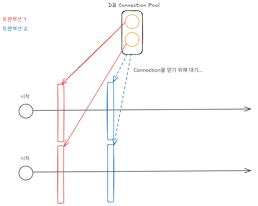 아래 그림과 같이 동시에 요청이 오면 빨간색 트랜잭션(이후 메인 트랜잭션이라 지칭)이 시작되고, 그다음 파란색 트랜잭션(이후 서브 트랜잭션이라 지칭)이 시작되어야 하지만 Connection Pool의 DB Connection이 모두 사용 중이라 더는 처리되지 못하고 대기하게 됩니다.