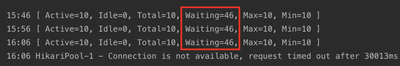 Connection Pool의 상태 변화를 모니터링하여 이상 징후를 감지할 수 있었습니다. 수십 초나 되는 시간 동안 Connection Pool의 상태가 변함없이 똑같은 상황이고, HikariPool의 Connection is not available 에러도 볼 수 있습니다. 정상적인 상황에서는 작업이 처리됨에 따라 Waiting 수가 줄어들어야 합니다.