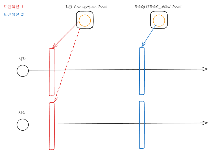 REQUIRES_NEW에서는 독립적인 새로운 트랜잭션을 시작하기 위해 DB Connection이 추가로 필요합니다.