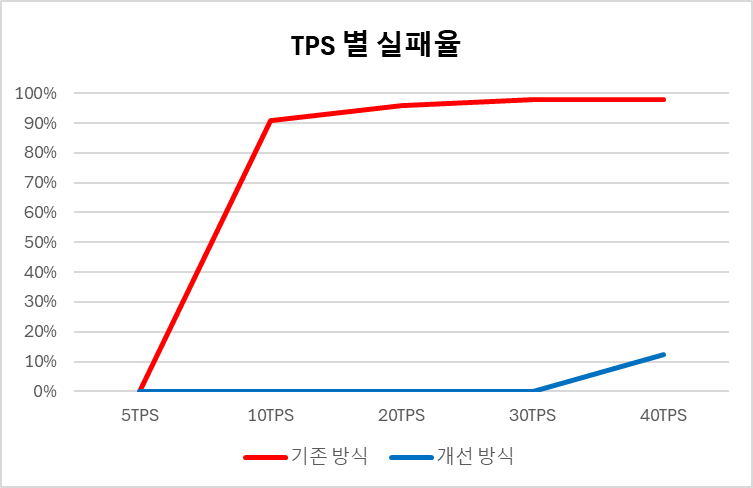 K6를 이용하여 기존 방식과 개선 방식의 TPS 별 실패율을 측정하였습니다.
